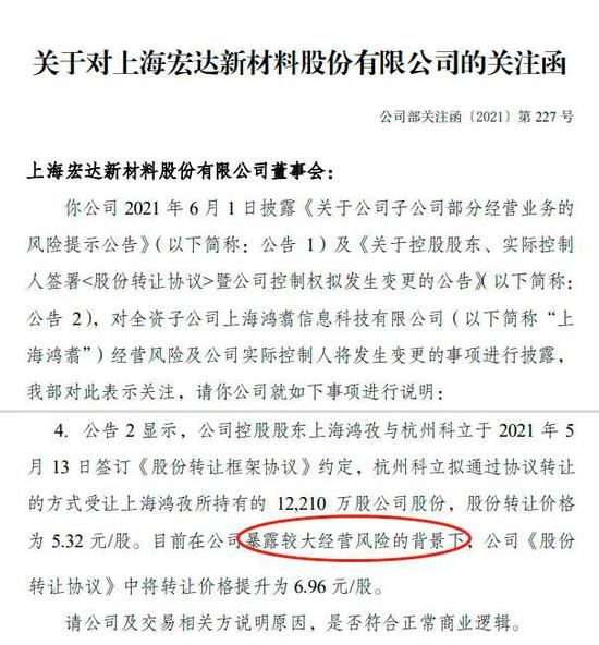 仅隔了不到三周的时间,宏达新材28.23%股权的转让价格就涨了2亿元,涨幅达到30%。随即,公司领到了深交所的关注函,被要求给个说法。