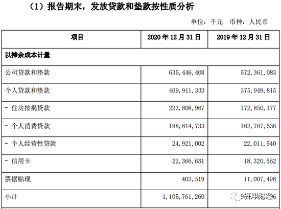 根据年报披露,个人贷款和垫款分为住房按揭贷款2238.09亿元(同比增长29.48%)、个人消费贷款1988.15亿元(同比增长增长22.15%)、个人经营性贷款249.21亿元(同比增长13.22%),以及信用卡223.67亿元(同比增长22.08%)。