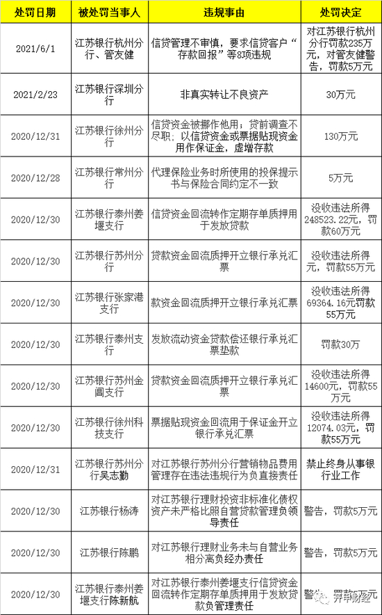 6月1日,银保监发布一则行政处罚,江苏银行杭州分行被罚款235万元;该行管友健被警告,并被罚款5万元。