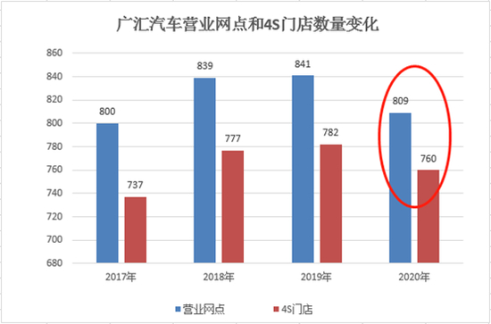 新浪财经统计后注意到,2017年至2020年,广汇汽车营业网点数分别为800家、839家、841家和809家,4S门店数分别为737家、777家、782家和760家,营业网点和4S门店数量均双双首次出现年度下滑。