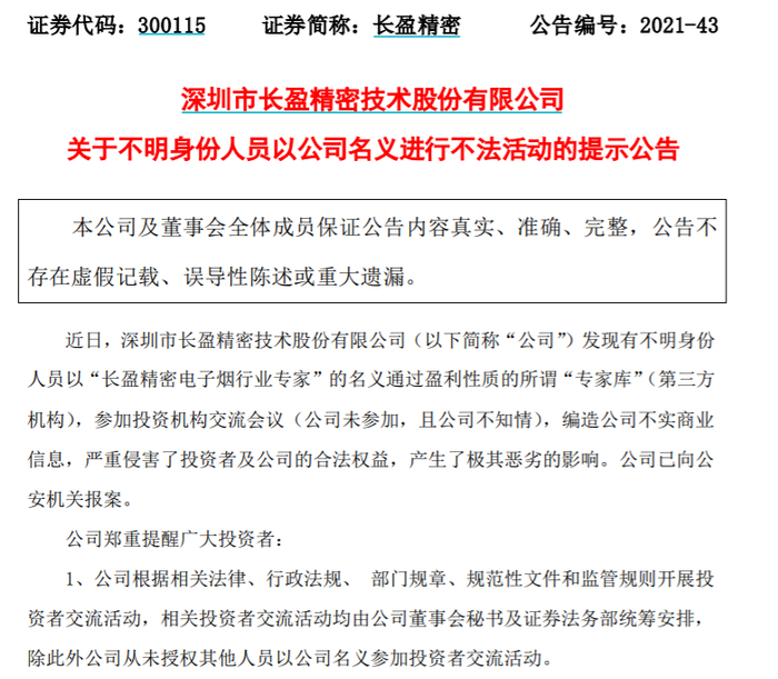 6月3日晚间,长盈精密公告称,有不明身份人员以公司电子烟行业专家名义,通过盈利性的所谓“专家库”方式参加投资机构交流会,编造公司不实商业信息。公司未参加且不知情,目前已向公安机关报案。