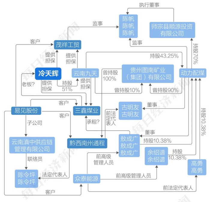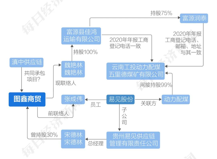 图鑫商贸和上市公司子公司合作承包项目,其年报历史登记电话为易见股份员工。此外,图鑫商贸目前的联络员又关联到动力配煤控股公司。动力配煤是易见股份关联方,其由云南九天持股43.2526%,后者由冷天辉持股51%。