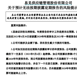 4月28日,易见股份公告称,因多项会计科目函证回函比例较低,部分回函比例未达函证总金额20%,可能无法按期披露2020年年度报告及2021年一季度报告,同时可能涉及业绩下修,存在发生重大亏损的风险。
