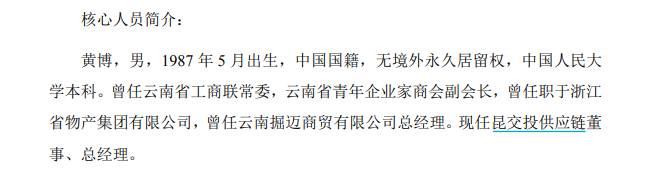 《每日经济新闻》记者注意到,ST沪科的重大资产重组事项也有名为黄博的人士的身影,且ST沪科对其身份进行了披露。ST沪科2019年公告称,拟收购昆交投供应链100%股权。ST沪科在相关交易预案(二次修订稿)中表示,黄博是在1987年5月出生,曾任云南省工商联常委,云南省青年企业家商会副会长。