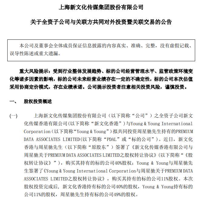 上市公司新文化(300336)与周星驰旗下公司Premium Data Associates Limited(PDAL)出现财务纠纷,新文化向香港国际仲裁中心提出申请,要求周星驰回购新文化持有的40%PDAL股权,并拟通过Young&Young向周星驰要求回购5%PDAL股权,本息共计8.41亿元。