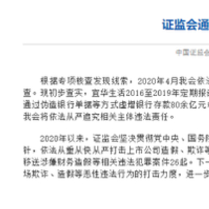 关于宜华生活涉嫌信披违法违规一案的具体情况,公告并未进行说明。但今年1月29日,证监会发布公告称,经初步查实,宜华生活2016至2019年定期报告存在严重虚假记载。一是通过虚构销售业务、虚增销售额等方式虚增利润20余亿元;二是通过伪造银行单据等方式虚增银行存款80余亿元;三是未按规定披露与关联方资金往来300余亿元。