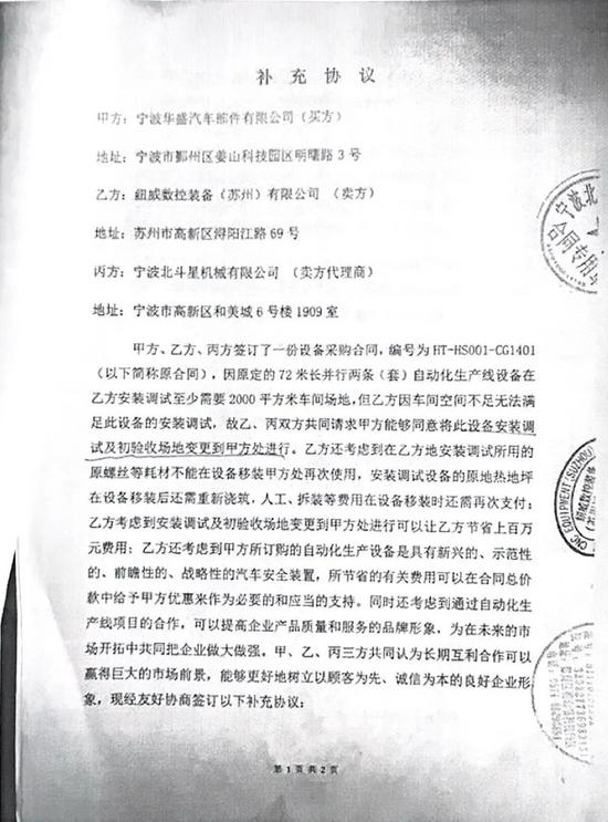 2014年9月,陈静良一行8人到纽威数控进行预验收,但却发现该生产线并没有被安装。对此,纽威数控向其解释:“该自动化生产线在其所需车间空间不足,没有调试条件。”后续,经双方协商,将设备安装调试及初验收场地变更至宁波华盛处,并于2015年5月14日签了补充协议。