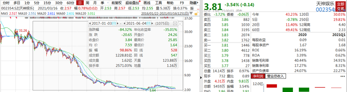 截至6月11日收盘,天神娱乐跌3.54%,股价报3.81元,总市值63.4亿元。股价较2017年最高点25.85元跌超85%