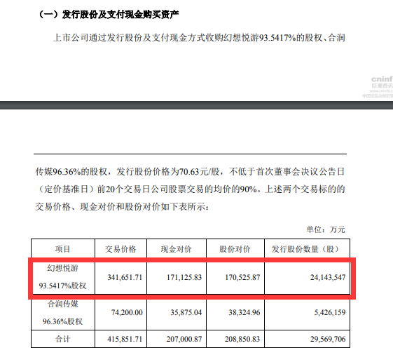 2017年12月8日,天神娱乐发布公告称,拟通过发行股份及支付现金方式收购幻想悦游93.5417%的股权、合润传媒96.36%的股权,发行股份价格为70.63元/股,最后交易价格分别为34.1亿元、7.4亿元。交易完成后,幻想悦游、合润传媒成为上市公司的控股子公司。