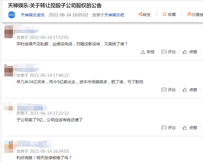 消息一出,股吧网友炸锅,议论纷纷。有网友表示,“早几年34亿买来,而今9亿卖出去,资本市场骗局多”,也有网友表示,“子公司卖了9亿,公司应该有钱还债了”,还有网友称,“利好消息!明天涨停板稳了吗?”。