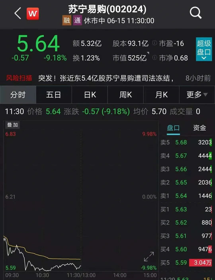 连爆两雷:苏宁易购盘中跌停 苏宁电器千万持股遭强平 张近东5.4亿股被司法冻结