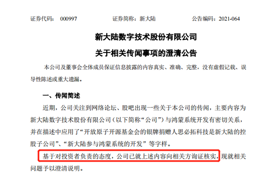 最近华为鸿蒙概念比较火,一些鸿蒙概念公司遭到热炒,或许是迫于监管的压力,某些上市公司都对此进行了澄清,但是看到新大陆这家公司的澄清公告,不得不说,写的真有艺术。