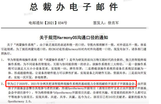 此前,6月4日,华为在心声社区发布关于规范HarmonyOS(鸿蒙)沟通口径的通知中表示,华为已于2020年、2021年分两次把鸿蒙操作系统的基础能力全部捐献给开放原子开源基金会,由其整合其他参与者的贡献形成Open Harmony项目。