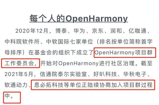 不久前,开源基金会官微发布的文中曾提到,2020年12月,博泰、华为、京东、润和、亿咖通、中科院软件所、中软国际七家单位在基金会的组织下成立了Open Harmony项目群工作委员会,开始对Open Harmony进行社区治理。截至2021年5月,信通院泰尔实验室、好叭科技、华秋电子、软通动力、思必拓科技等单位正陆续协商加入项目群过程中。