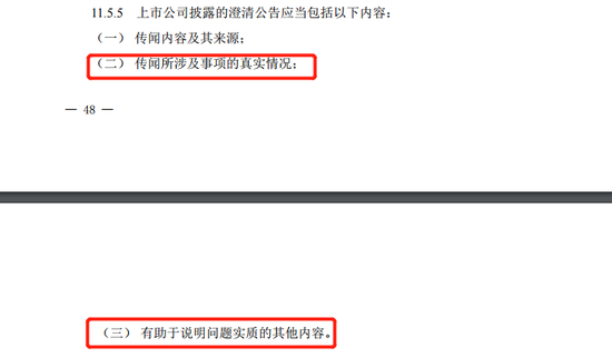 关于对上市公司传闻澄清公告的要求,深交所《股票上市规则》11.5.5表示,澄清公告要包括三部分内容,其实核心是“真实情况”“问题实质”。
