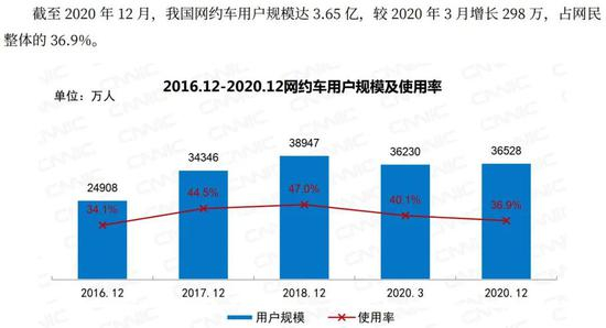 今年2月,中国互联网络信息中心(CNNIC)发布的第 47 次《中国互联网络发展状况统计报告》显示,截至2020年12月,我国网约车用户规模达3.65亿,虽然较2020年3月微增了298万,但仍未回归到2018年12月高峰期的3.89亿,用户的使用率也在不断下降。