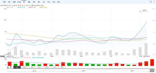 与端午节前的6月11日收盘价9.33元/股相比,两个交易日内涨幅为8.36%。