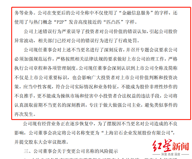 2017年8月,该公司启动第四次改名。公司名称由“匹凸匹金融信息服务(上海)股份有限公司”变更为“上海岩石企业发展股份有限公司”,证券简称变更为“岩石股份”。该公司称,“不做P2P了,公司的经营范围将剔除互联网金融信息服务业务。”