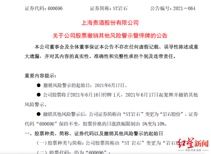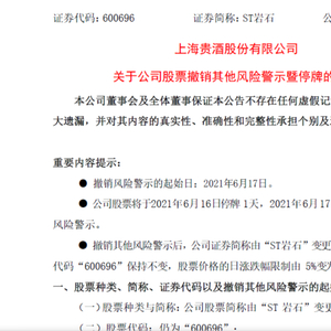 6月16日,上海贵酒发布公告称,公司股票6月17日起撤销其他风险警示。撤销其他风险警示后,公司证券简称由“ST岩石”变更为“岩石股份”,股票价格的日涨跌幅限制由5%变为10%。