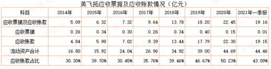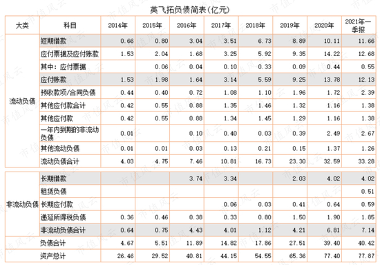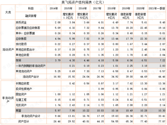 先看英飞拓2014年至2021年一季度资产简表(下表)。