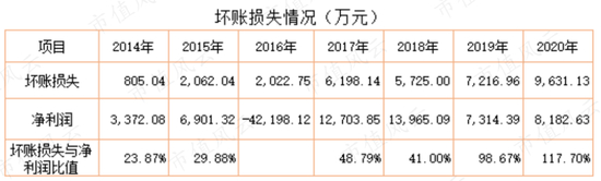 应收账款的增加导致计提坏账损失在增加,2017年以来坏账损失金额占到当期净利润的40%以上,2019年、2020年占比达98%、118%。