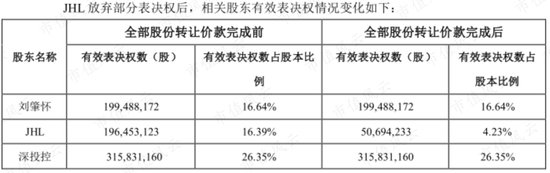 2019年11月18日,刘老板控制JHL再次向深投控转让其持有的英飞拓5993.38万股,占总股本的5%,转让总价款3.43亿元;同时JHL放弃其所持有的英飞拓1.46亿股(占总股本为12.16%)的表决权。