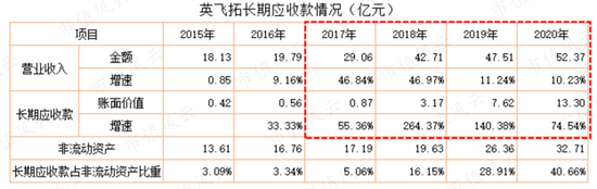 从下表也可以清晰看出,英飞拓的营业收入快速增长与长期应收款激增时间段重合。