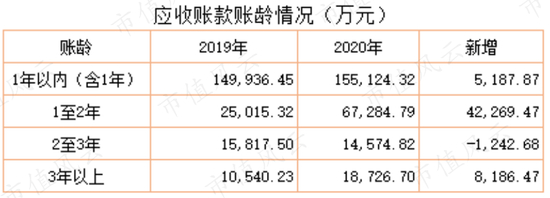 从上表可以清晰看出2020年报的应收账款中,1至2年的有6.72亿元,较2019年增加4.2亿元,2至3年的有1.45亿元,超过3年账龄的应收账款有3.73亿元,较2019年增加8186万元。
