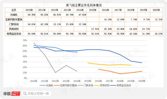 作为第一大业务的视频监控系统,从50%多的毛利率降至2020年的28%;2016年至2019年,民用安抚业务的毛利率也出现小幅下降。