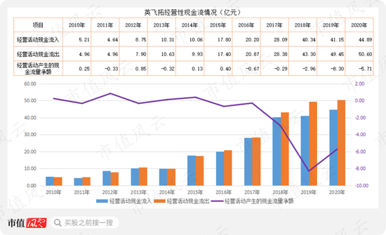 英飞拓自上市以来的11年(2010年至2020年)间只有4个年度的经营性现金流为正值,其他年度均为负值,经营性现金累计净流出近17亿元。