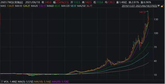 长荣海运为中国台湾地区海运巨头之一,2020年3月份,股价一度低至8.9元新台币,此后股价一路上涨,截至6月18日,公司最新股价为140元新台币,涨幅高达14.7倍。