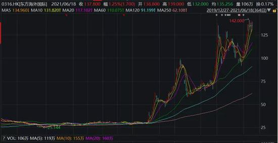 H股东方海外国际自2020年开始股价现连续上涨。东方海外国际2020年一季度股价一度跌破30港元,但到了今年股价一度突破140港元,一年多的时间最多翻了4倍以上。