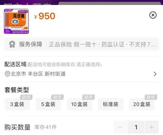 片仔癀的天猫旗舰店“片仔癀大药房旗舰店”此前有销售片仔癀,但目前该商品网页显示“已经下架”。部分网店的3盒装、5盒装、10盒装、20盒装已显示缺货,只能购买标准装,即1粒装。有网店客服向中新经纬称,最近片仔癀厂家限制出货,他们也没货。