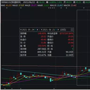 6月22日,科蓝软件低开低走,盘中最大跌幅达10.93%,截至收盘,股价大跌6.88%,报46.00元/股,全天成交额38.98亿元,换手率高达34.48%。而在昨天,科蓝软件股价强势涨停,与今天的表现“冰火两重天”。