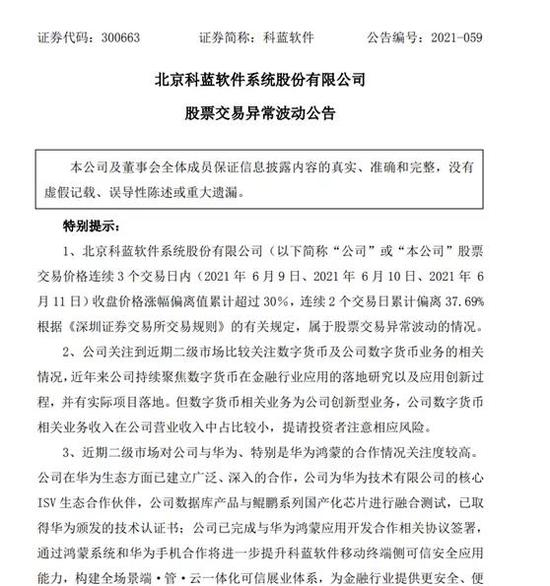 证券时报记者发现,6月11日科蓝软件曾披露风险提示称,近年来公司持续聚焦数字货币在金融行业应用的落地研究以及应用创新过程,并有实际项目落地。此外,公司在华为生态方面已建立广泛、深入的合作,公司为华为技术有限公司的核心ISV生态合作伙伴,公司数据库产品与鲲鹏系列国产化芯片进行融合测试,已取得华为颁发的技术认证书;公司已完成与华为鸿蒙应用开发合作相关协议签署,通过鸿蒙系统和华为手机合作将进一步提升科蓝软件移动终端侧可信安全应用能力。