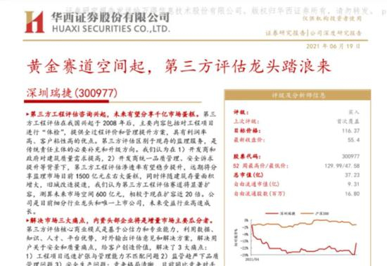 6月19日,华西证券发布题为《深圳瑞捷:黄金赛道空间起,第三方评估龙头踏浪来》的研报,也是该公司上市后获券商发布的首份深度研报。这份研报认为,“公司2021年仅21.8倍PE估值,内在价值被严重低估,给予公司基于市场法估值的116.37元为目标价,未来6个月潜在空间110%”。