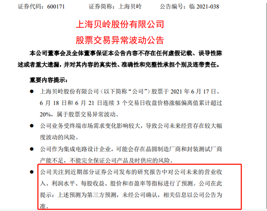 6月22日,近日再获三连板的上海贝岭(600171)在回复监管函中公开回应称,券商研报的预测“未经公司确认”。