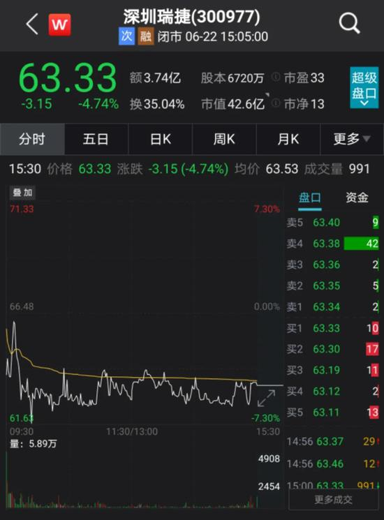 Choice数据显示,深圳瑞捷当日报收63.33元,涨跌幅为-4.74%,换手率35.04%,振幅7.9%,成交额3.74亿元。