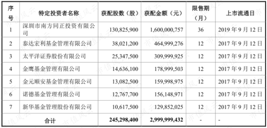 2016年9月8日定增发行完成,以12.23元/股的价格向南方同正、泰达宏利基金、金鹰基金等7家机构合计发行2.45亿股,募资30亿元。