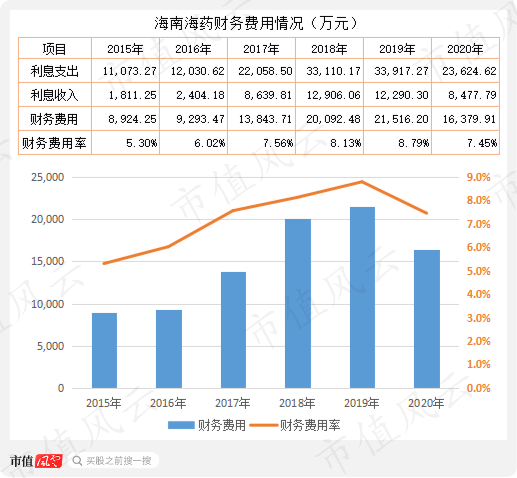 海南海药的财务费用也令人颇为费解。2015年至2019年,海南海药的财务费用绝对值以及财务费用率都逐年增加;从明细来看,利息支出从2015年的1.1亿元增加到2019年的3.4亿元,增长了2倍。