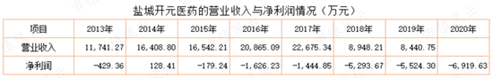 2018年后盐城开元医药亏损额明显增加,2018年至2020年,每年亏损均在5千万以上,2013年至2020年累计亏损达2.13亿元。