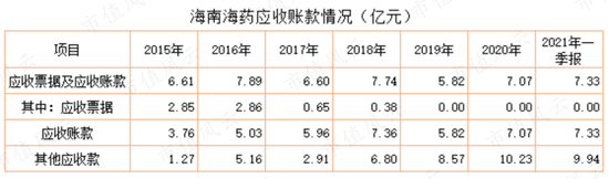 此外,截止2020年末,海南海药其他应收款高达10.2亿元(2021年一季度末降至9.9亿元)。