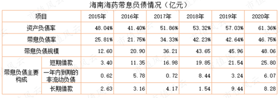 具体来看,短期借款从2015年的3.4亿元增长到2020年的25.8亿元,长期借款在2019年突然增加到9.4亿元。不难看出,海南海药最近几年加杠杆非常猛。