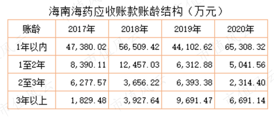 从应收账款的账龄结构来看,2019年的应收账款中2至3年、3年以上的账龄金额明显增加,2020年的应收账款中1年以内的账龄金额占比最大,2年以上的账龄金额下降明显,似乎海南海药的应收账款结构正在改善。