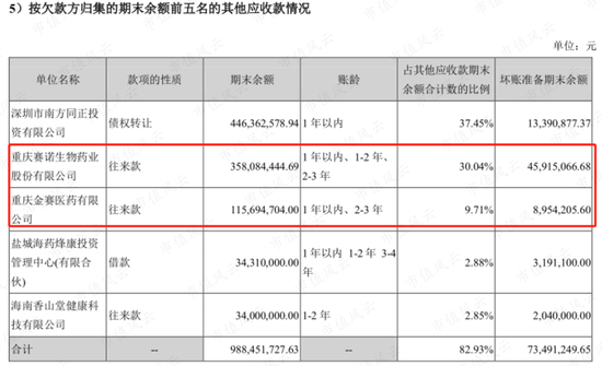 根据2020年度报告披露的信息,其他应收款中欠上市公司钱较多的分别是南方同正4.46亿元,重庆赛诺生物及其全资子公司重庆金赛医药分别欠3.58亿元、1.16亿元。