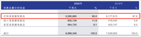 这与蓝月亮的营收结构基本吻合,2020年,蓝月亮的衣物清洁护理产品占总收入的80%,家居清洁产品及个人清洁护理收入分别占据8.1%及11.9%。