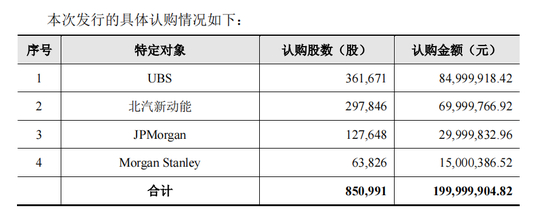 公告显示,亿华通本次定增对象为瑞银、北汽新动能、摩根大通和摩根士丹利 ,分别出资认购约8500万元、7000万元、3000万元以及1500万元,发行股票的数量为85.1万股,募资总额合计约为2亿元。