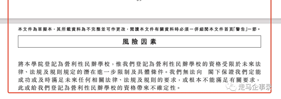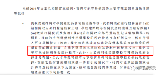 此外,目前的法例对营利性民办学校的税收待遇没有任何规定,仍有待引入更多具体的规定,甚至可能被追溯征收额外税项,可获得的政府支持非常有限,再加上营利性民办高等教育业务在中国的历史相对较短,且获得广泛认可可能需要时间,对学校的招生和收益可能会产生重大不利影响。