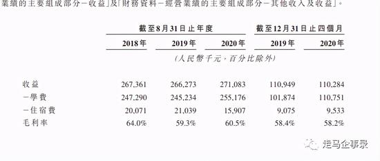 翻看招股书可以发现,通才教育大部分营收来源为学费和住宿费,近三年通才教育的收益大致保持稳定,招生人数稳步增长。2018~2020财年,公司营收分别为2.67亿元、2.66亿元和2.71亿元,每学年的总招生人数分别是16278人、16616人、17233人。