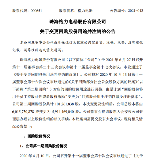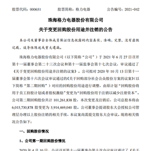 6月27日,格力电器发布公告称,公司召开第十一届董事会第二十三次会议和第十一届监事会第十七次会议,审议通过了《关于变更回购股份用途并注销的议案》。